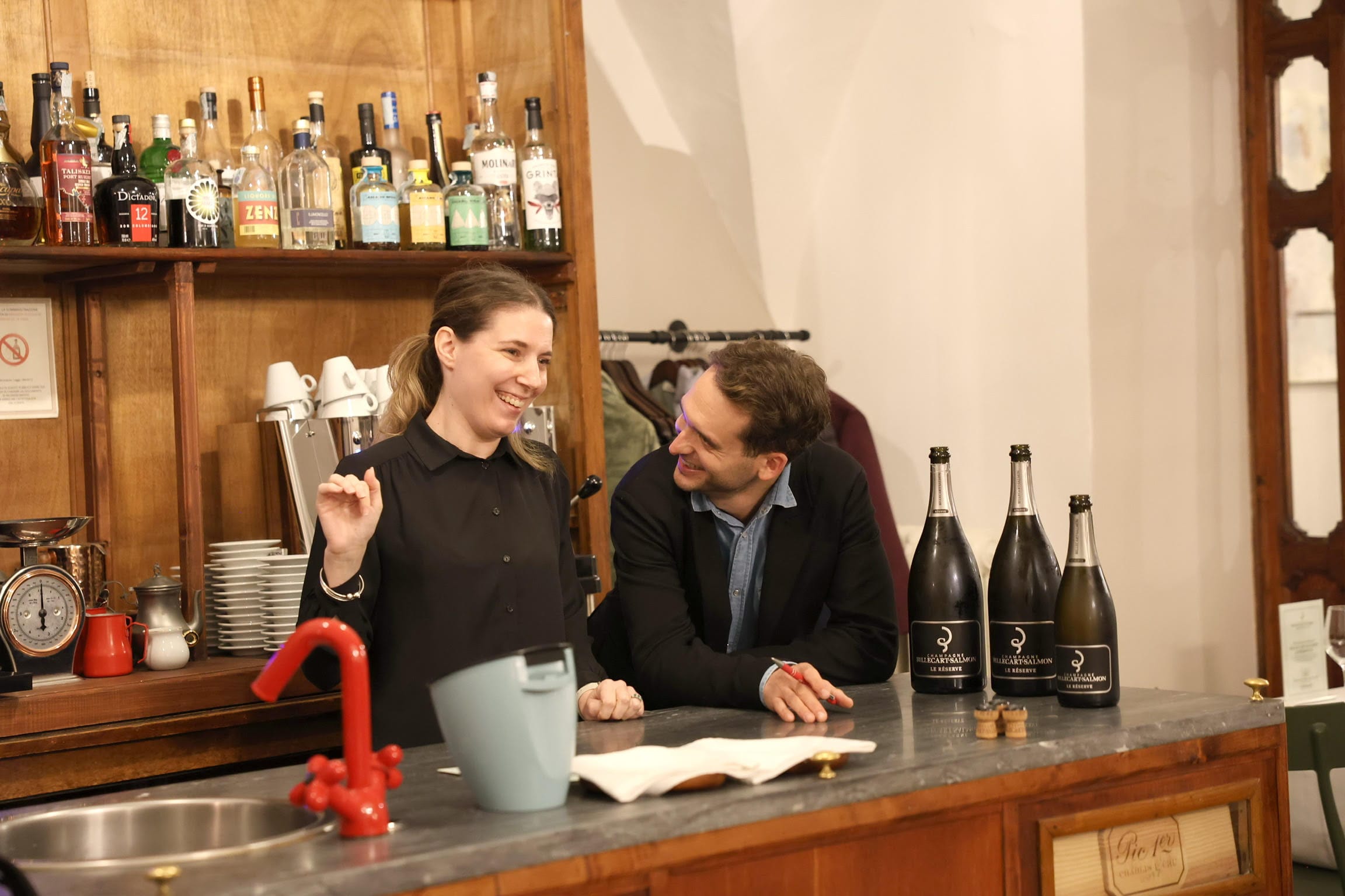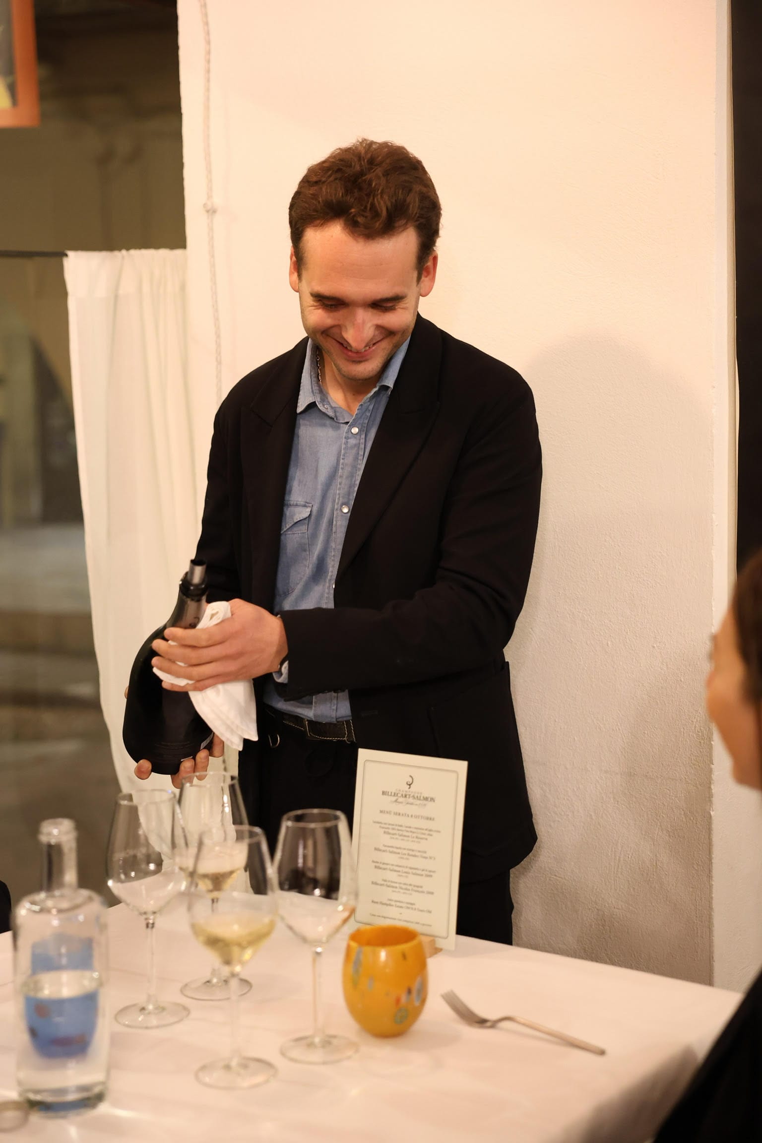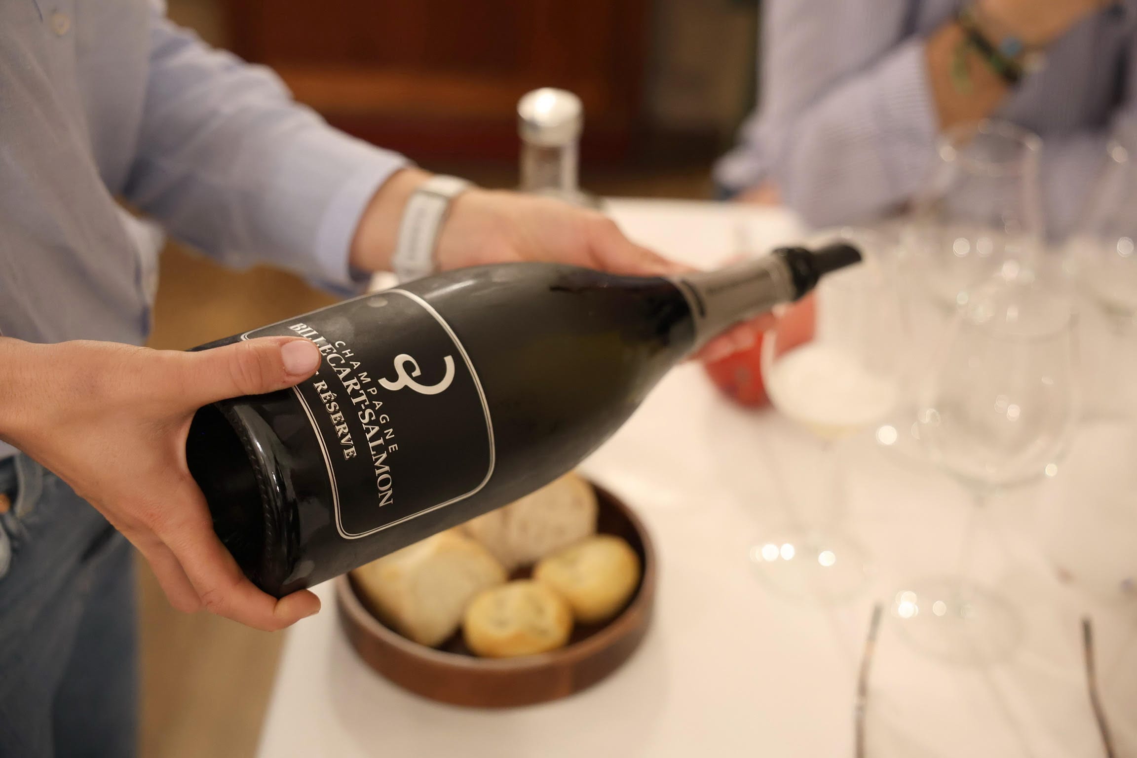 Gruppo di sei persone con bottiglie di Champagne Billecart-Salmon e il menù